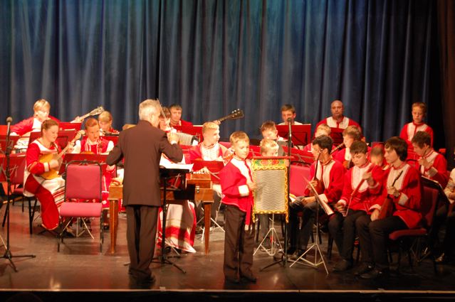 Only it hadn't. There was a show to do. An array of young Russians in national costume sat on stage playing a range of their folk music alongside some other classical pieces from around Europe , rapidly changing the soloists and all under the firm baton of leader Pavel Sergeev. The audience was hooked. Even Town Mayor Dave Loveridge invaded the stage, handed over a bottle of Somerset cider brandy , did a soft shoe shuffle with his walking stick and looked as though he was about to perform a stage dive. The audience loved it and by the time they were performing a Beatles medley they were all singing along.
